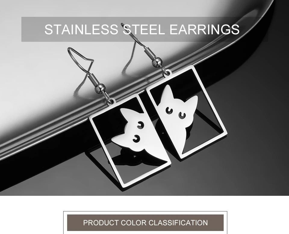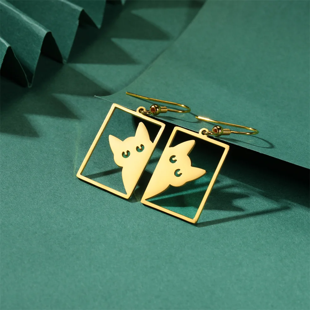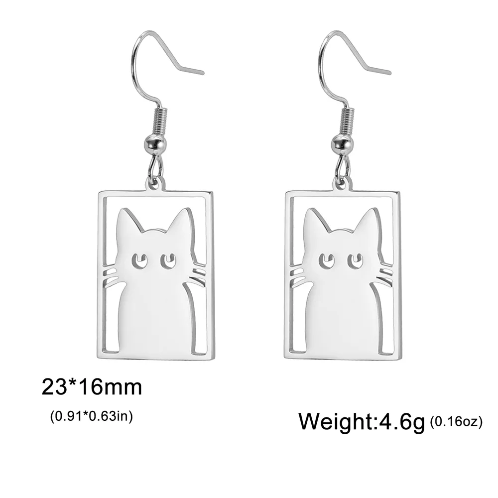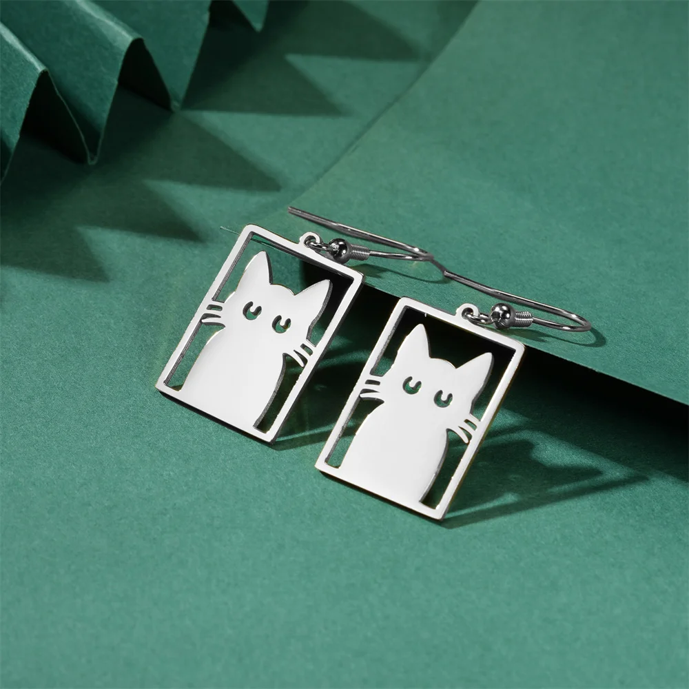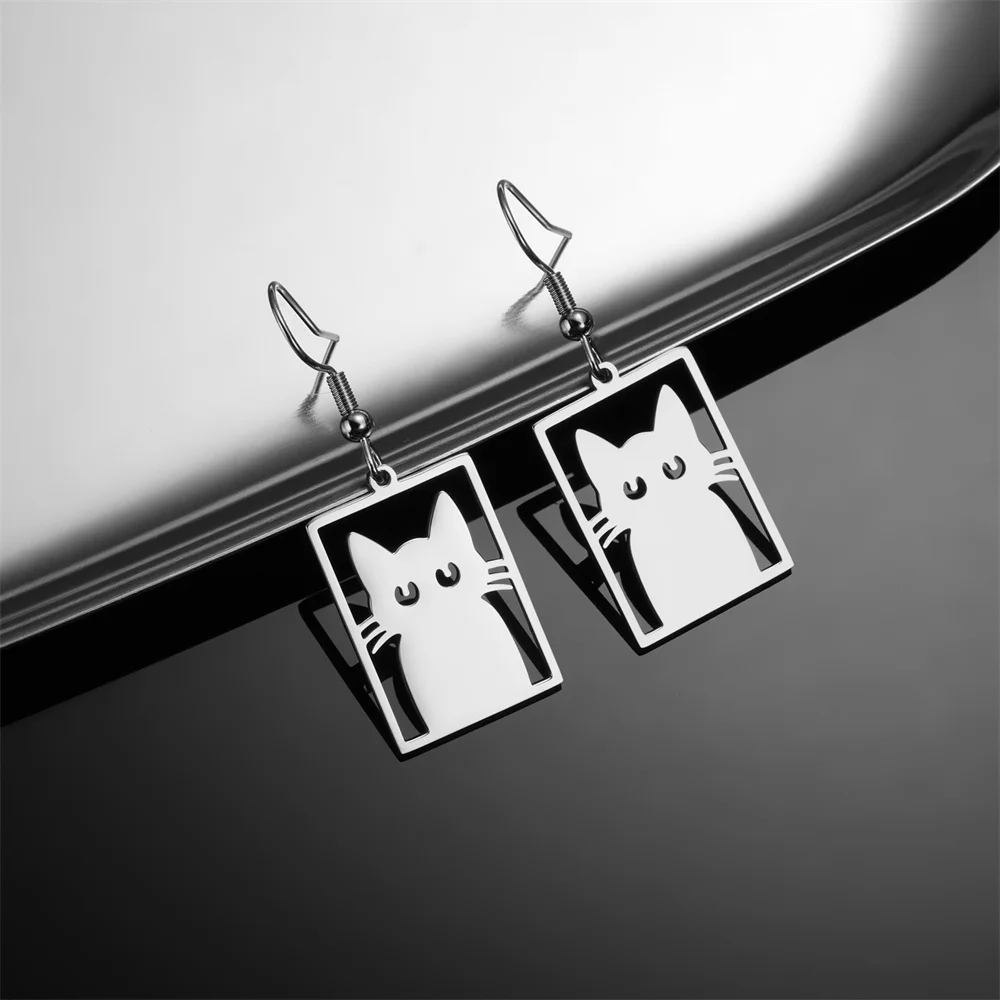 These trendy stainless‑steel drop earrings feature a modern rectangular frame with a sweet cat cut‑out — the perfect blend of minimalist style and feline charm. Lightweight, durable, and designed for everyday wear, they’re a stylish pick for women and girls who love expressing their cat‑loving personality in a chic, understated way.