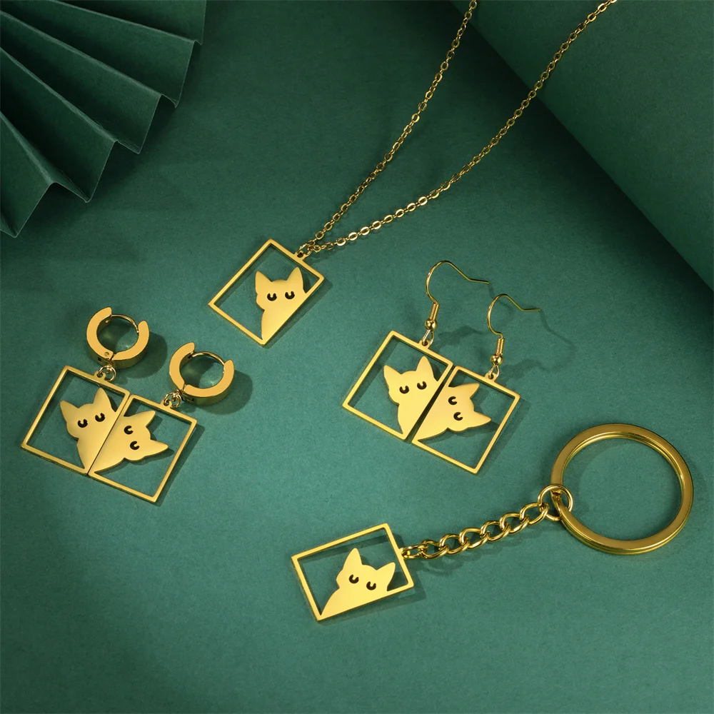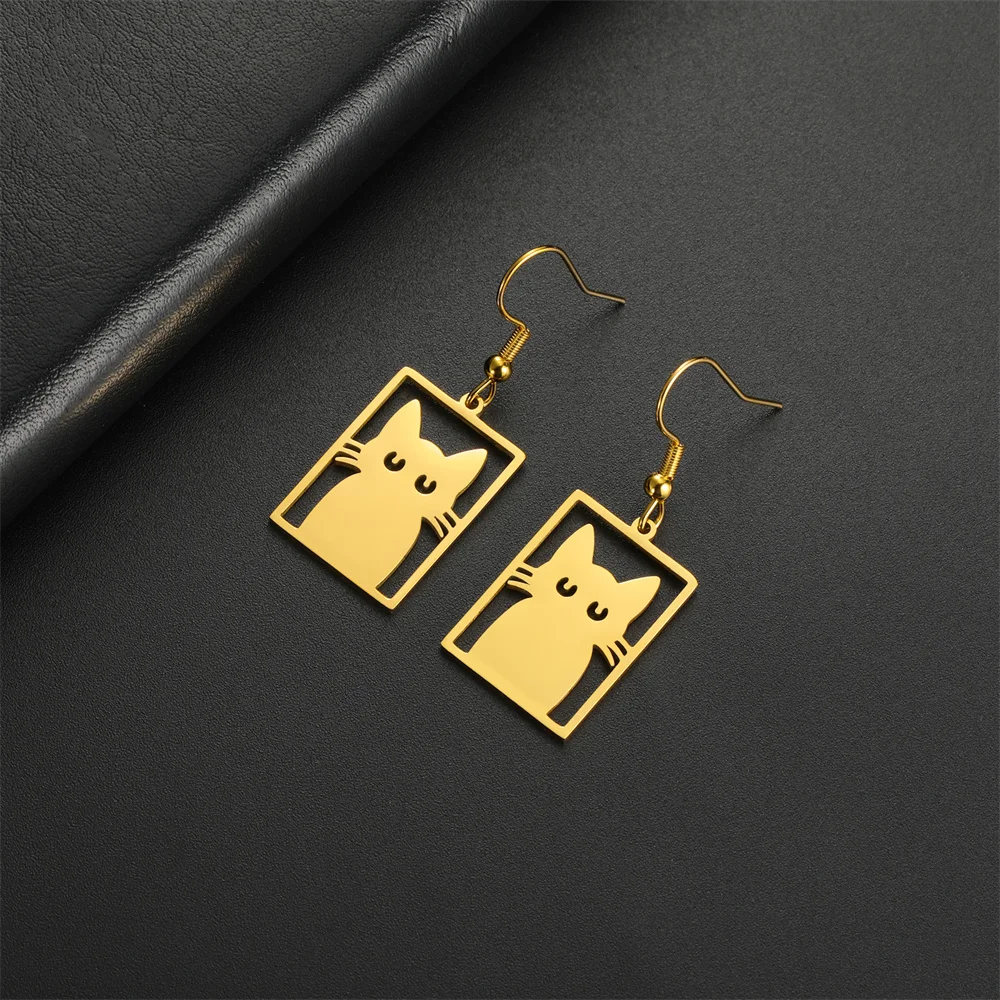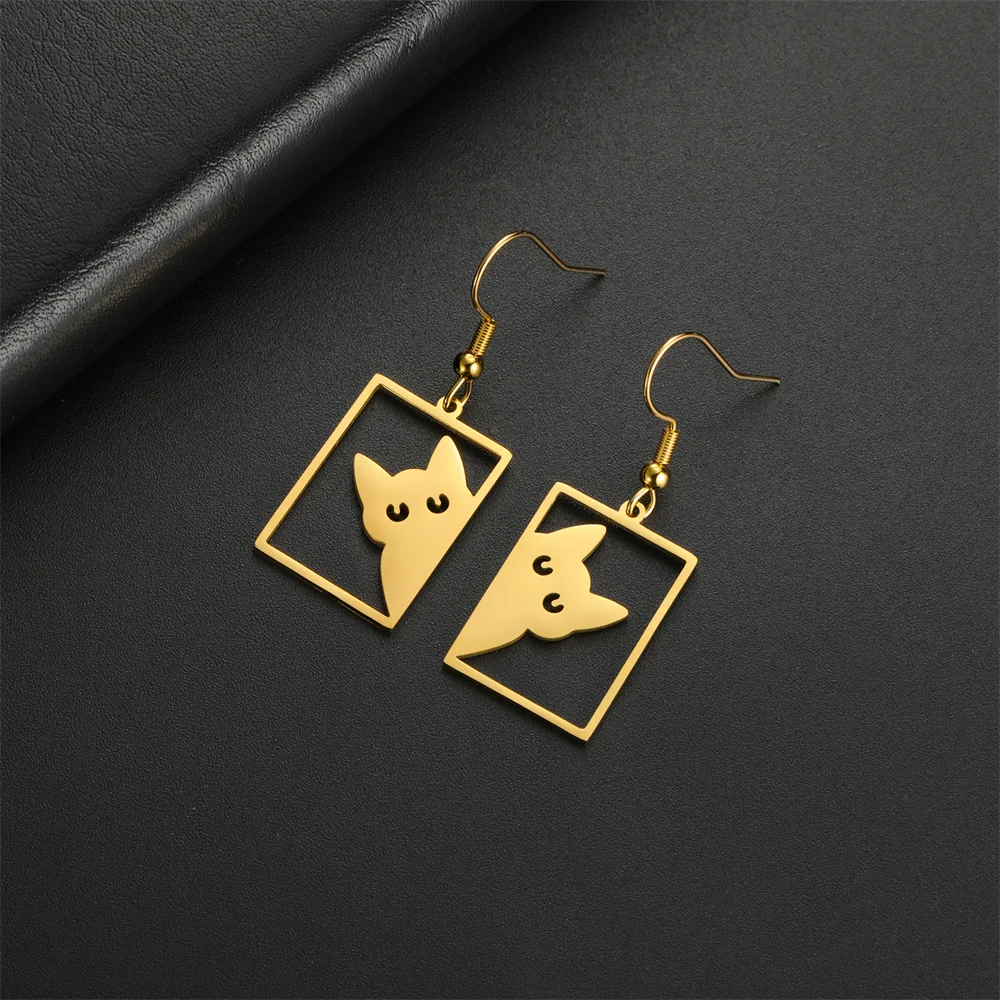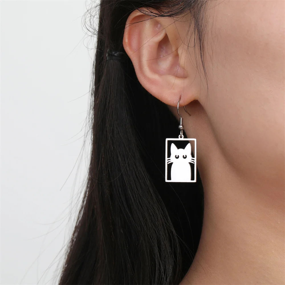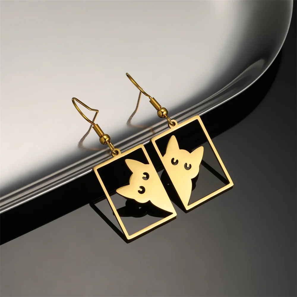 These trendy stainless‑steel drop earrings feature a modern rectangular frame with a sweet cat cut‑out — the perfect blend of minimalist style and feline charm. Lightweight, durable, and designed for everyday wear, they’re a stylish pick for women and girls who love expressing their cat‑loving personality in a chic, understated way.