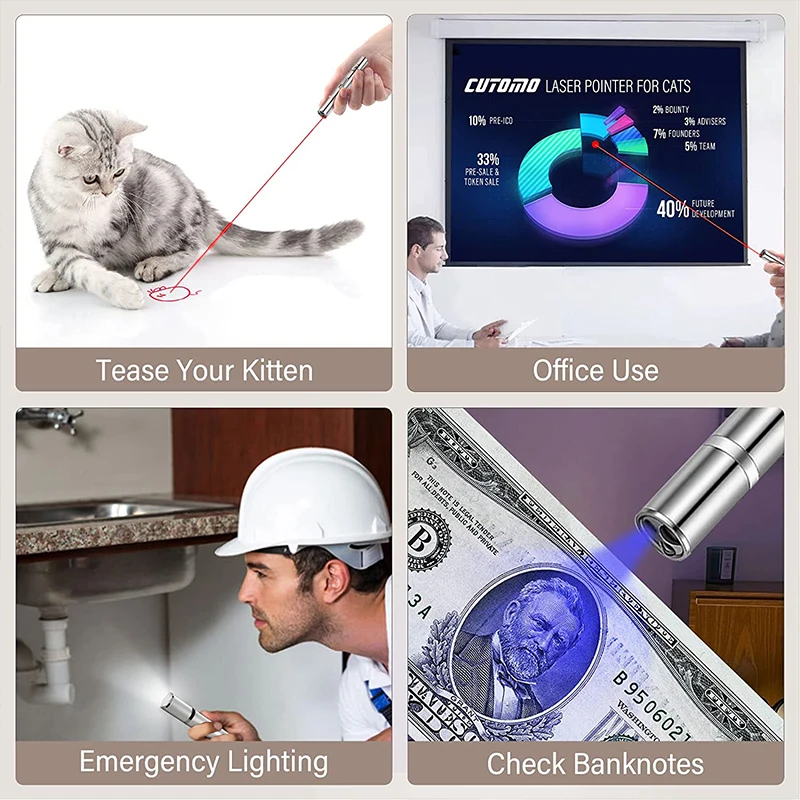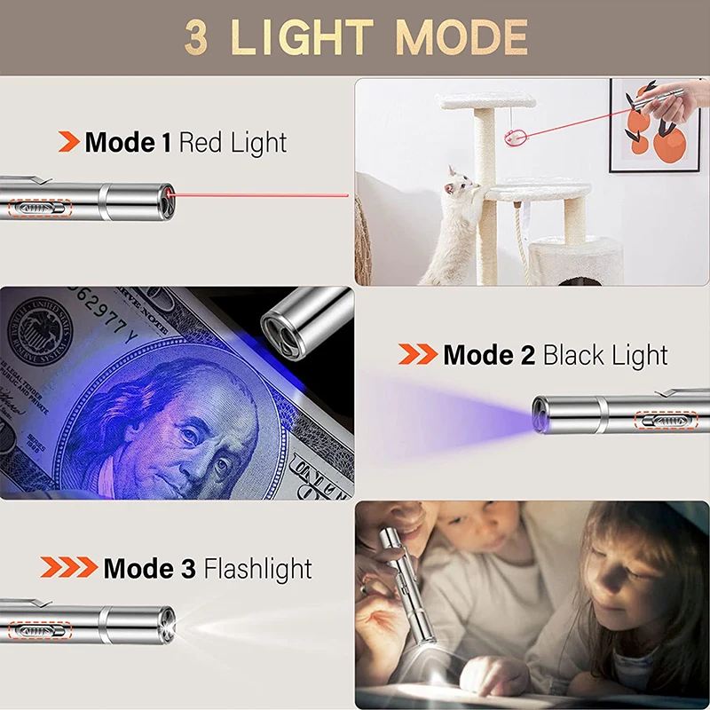 🐾 Triple the sparkle: Red laser for play, purple for mystery, white LED for flashlight duty