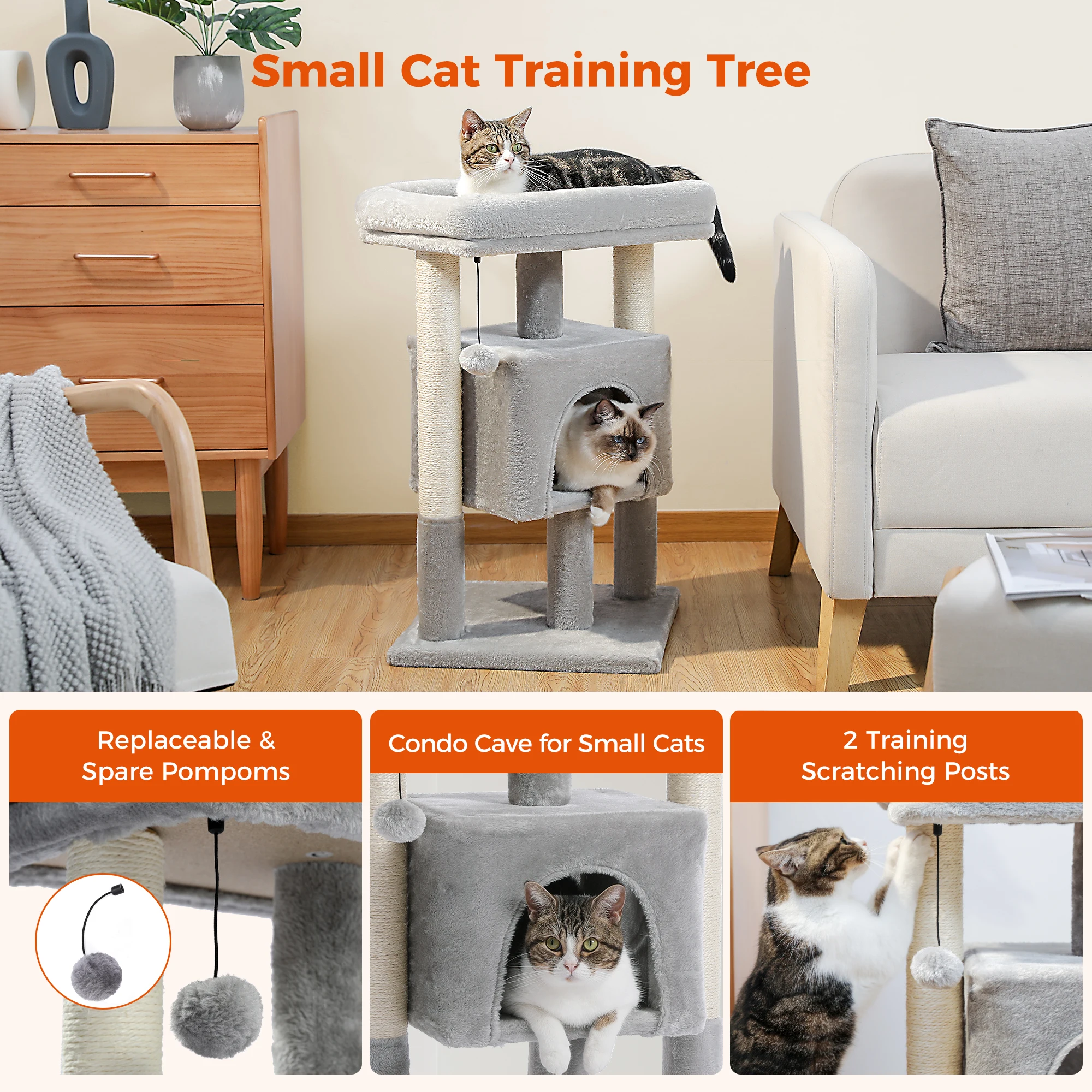 PAWZ Road Small Cat Tree Tower Bring big fun to small spaces! This three‑tier cat tree is the ultimate cozy playground for indoor cats. With natural sisal scratching posts, a soft top perch, and a plush pom‑pom toy, it’s designed for endless play, naps, and feline flair.