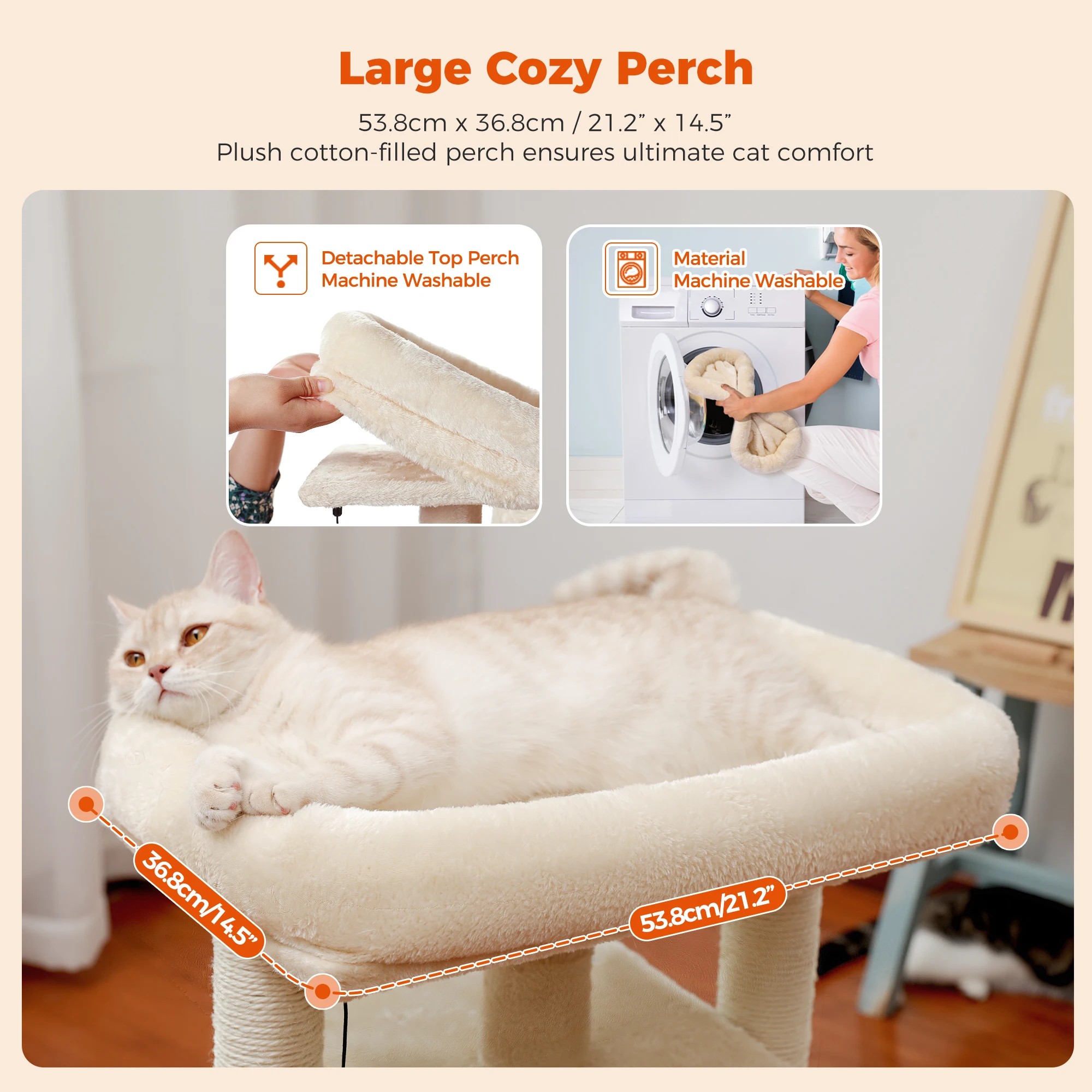 COZY AND WIDENED PERCH: 2 nicely cushioned and extra-large cat perch with raised edge offers prime relaxing spot for your fur babies to lie down or sit on to look out the window. The top perch is designed big enough to hold 2 kittens at the same time so that these 4 good friends can enjoy a nice sleeping or playtime together.